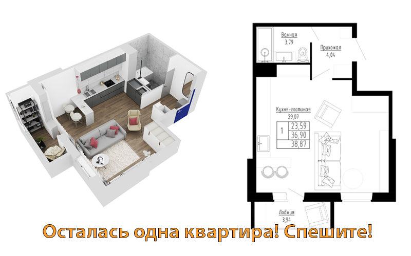 Мы можем вам предложить квартиру студию почти 40 кв.м. Такая квартира подойдет и одинокому студенту, и молодой семейной паре, и покупателям зрелого возраста. В общую площадь комнаты входит кухонная зона, в которой устанавливается электроплита и раковина. Кухонный гарнитур вы выберите сами под свои запросы. Два окна позволят вам разделить площадь 30 кв.м. по своему желанию, поставив или стационарную перегородку, или отделив жилую площадь от кухни стеллажом, шторой или другим способом. И даже при желании можно выгородить две спальни! В квартире есть лоджия около 4 кв. м., здесь у вас будет возможность отдохнуть после трудового дня, хранить сезонные вещи и даже выращивать рассаду. Совмещенный санузел укомплектован всей необходимой сантехникой, в прихожей есть место под вместительный шкаф-купе.
