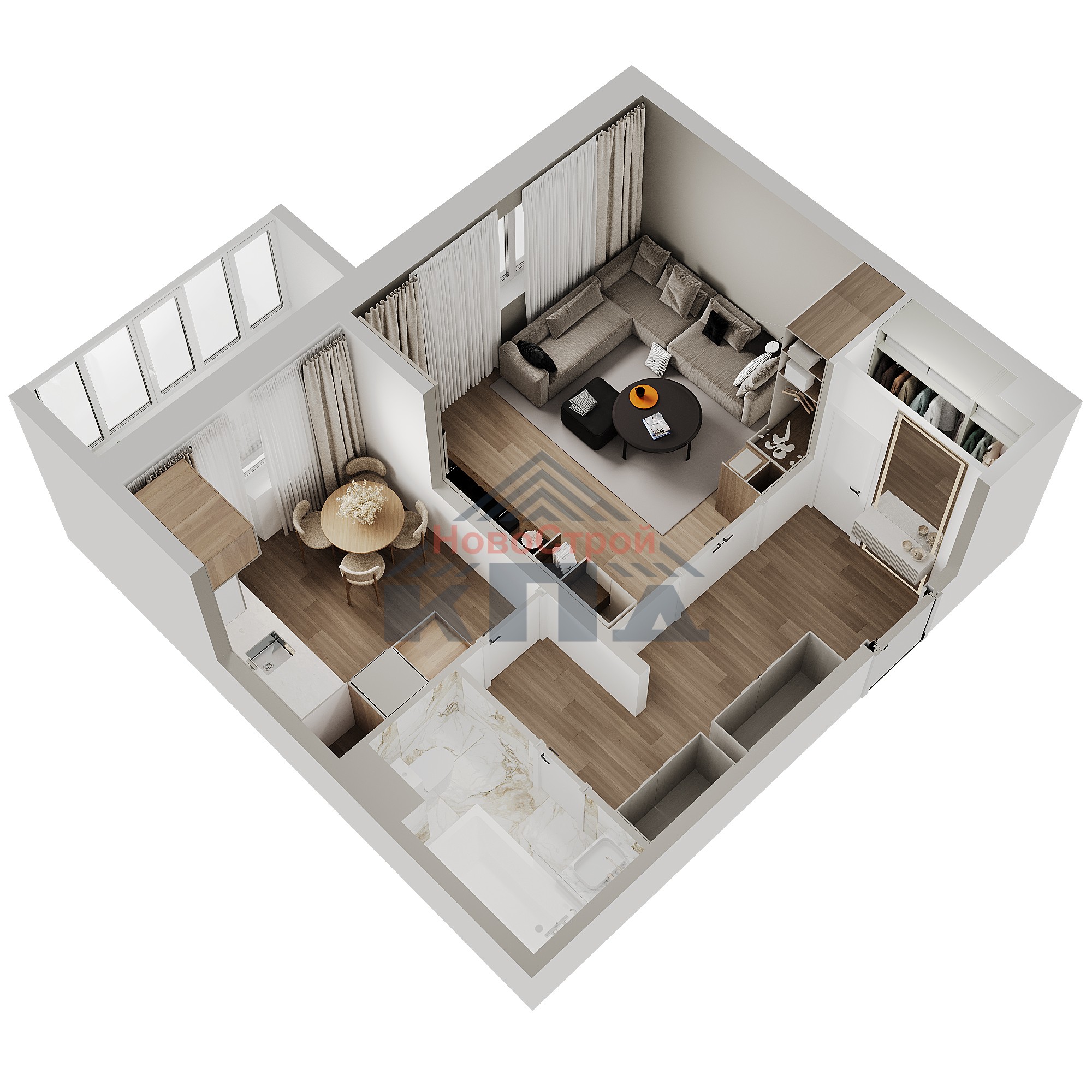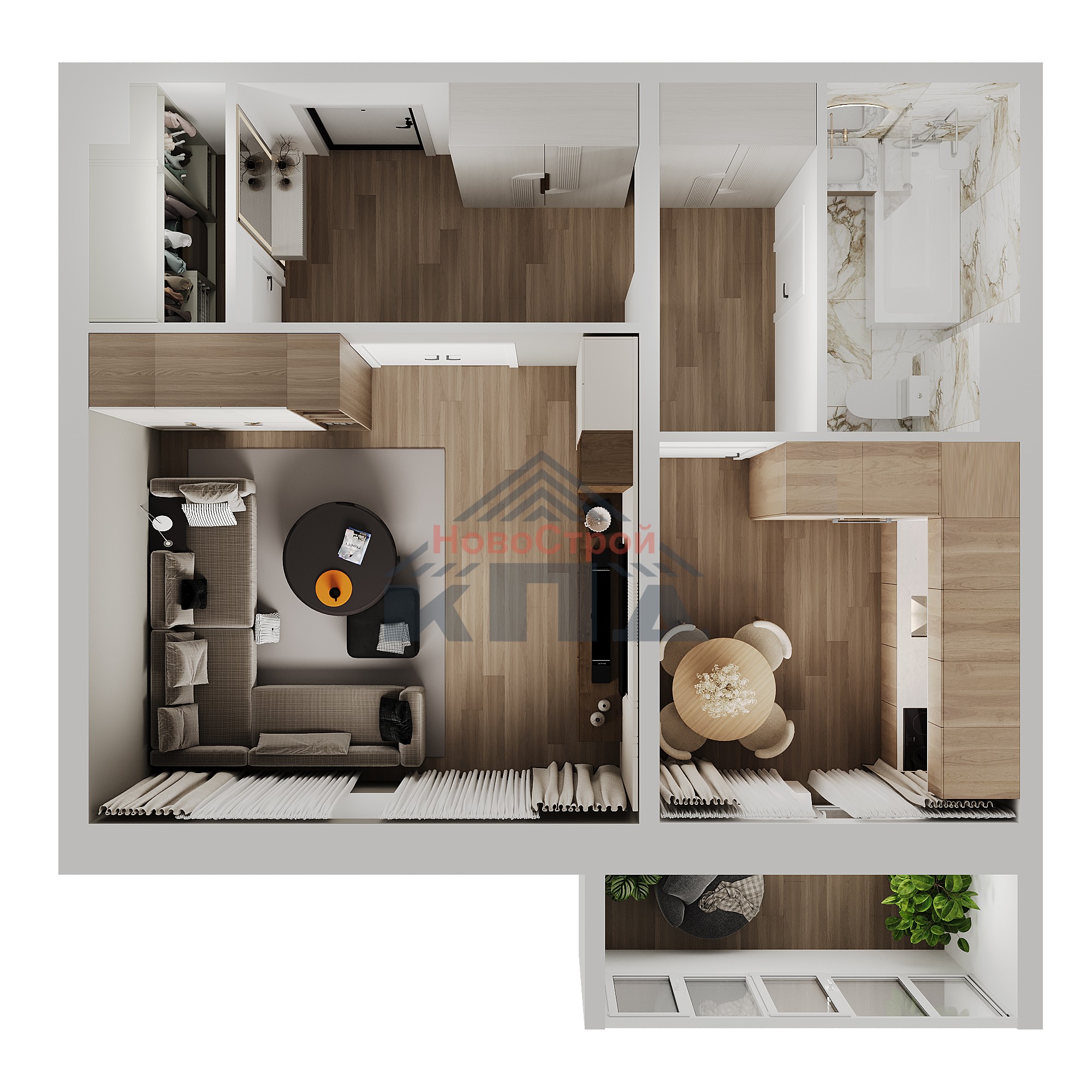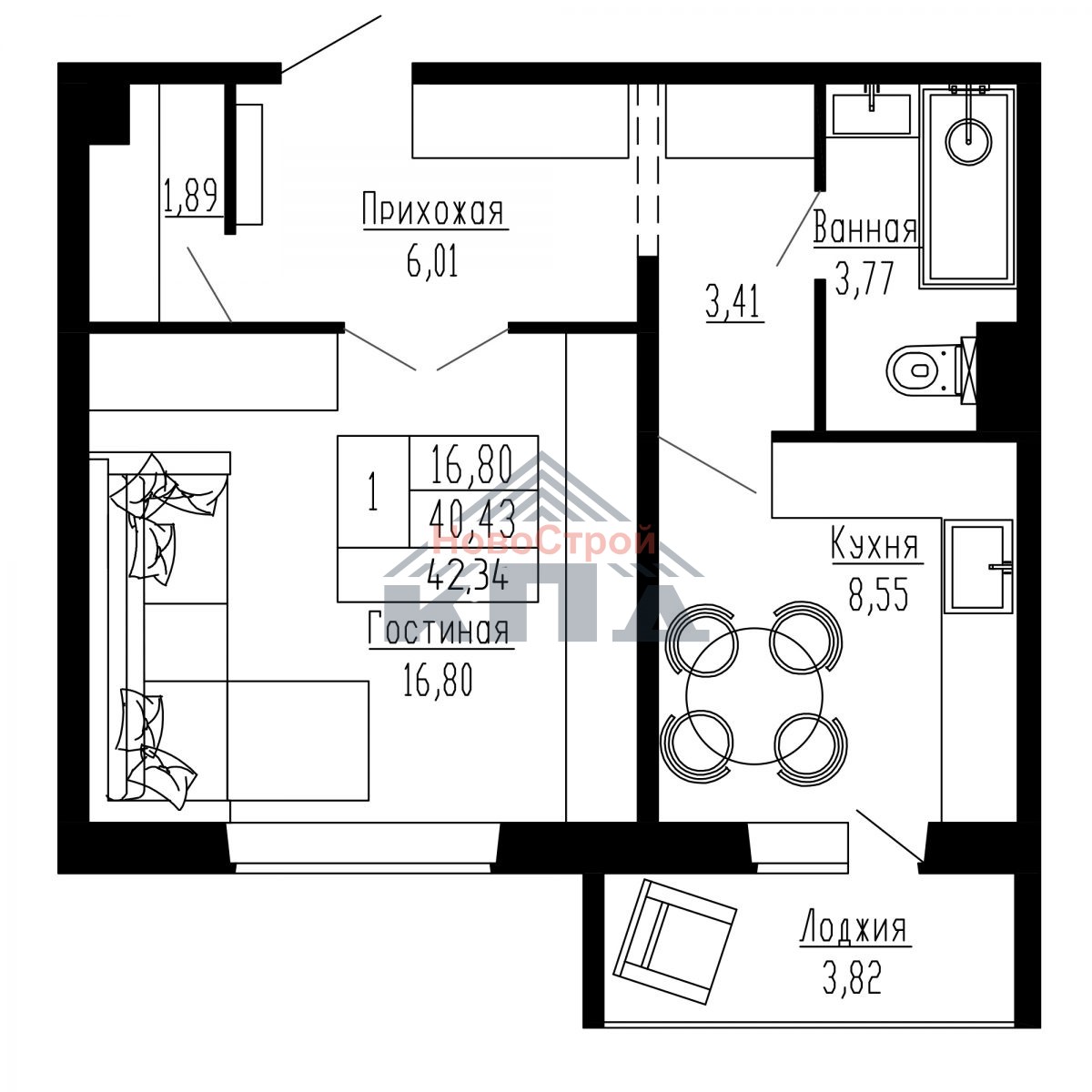 1-комнатная квартира общей площадью (44,25) 42,34 кв.м. с увеличенным холлом площадью около 6 кв.м., при входе в квартиру выгорожен сушильный шкаф. Здесь можно установить вместительный шкаф-купе и даже спортивные тренажеры для всей семьи. Площадь жилой комнаты почти 17 кв.м., она квадратная в плане. Здесь легко разместиться и спальное место, и детская кроватка, и даже останется место под небольшой рабочий кабинет или мастерскую. Из квадратной уютной кухни площадью почти 9 кв.м. можно выйти на лоджию около 4 кв.м. Очень удобно зимой замораживать продукты, летом сушить белье, а после трудовых будней и в выходные можно просто отдохнуть на свежем воздухе. Совмещенный санузел почти 4 кв.м. оснащен всем необходимым сантехническим оборудованием, на кухне устанавливается электроплита.