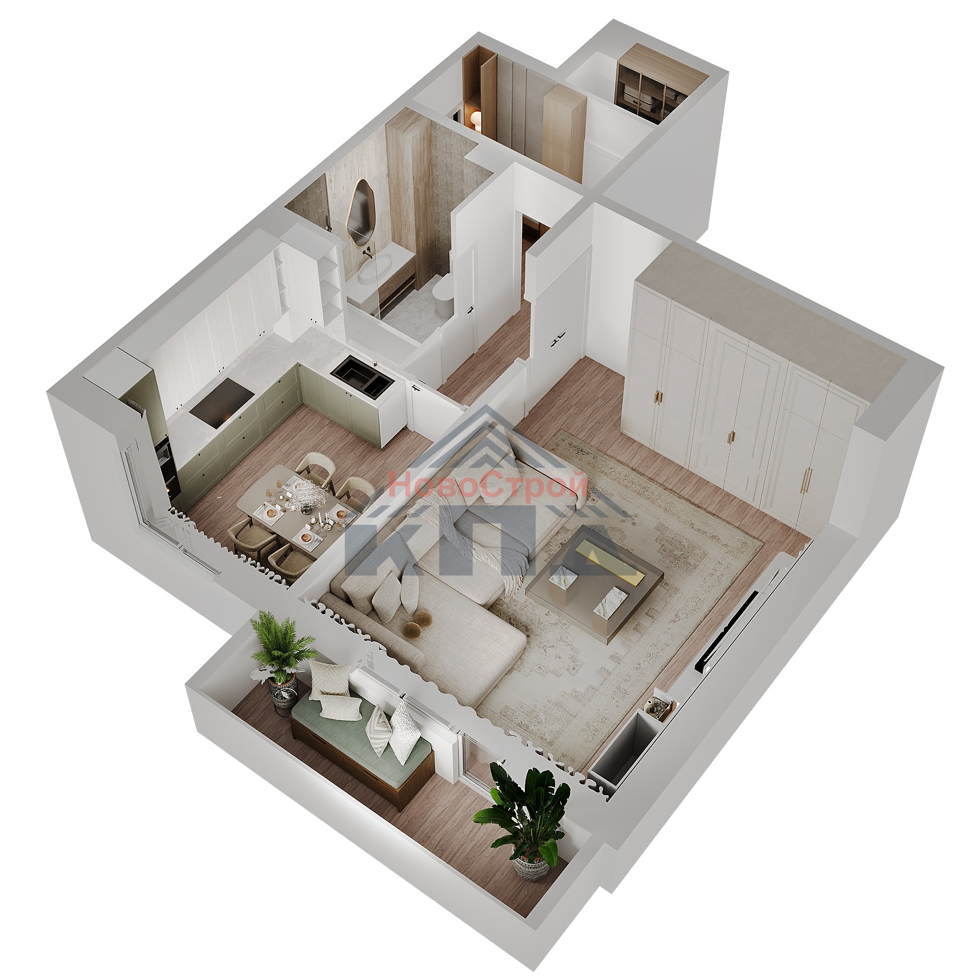 1-комнатная квартира общей площадью 49, 43 (52,07)кв.м. с шикарной гостиной-жилой комнатой более 25 кв.м. Места под мебель, технику и вместительный гардероб будет достаточно даже для семьи из четырех человек. Также из комнаты можно выйти на лоджию более 5 кв.м. Эта дополнительное помещение будет вам подспорьем и в организации хозяйственных работ (хранение сезонных вещей, выращивание рассады и цветов и др.), а также и в обустройстве места для отдыха, медитации, чтения и т.д. Кухня укомплектована электроплитой и раковиной. Рядом расположен совмещенный санузел около 4 кв.м. с ванной и другим сантехническим оборудованием. В прихожей выгорожен сушильный шкаф.