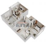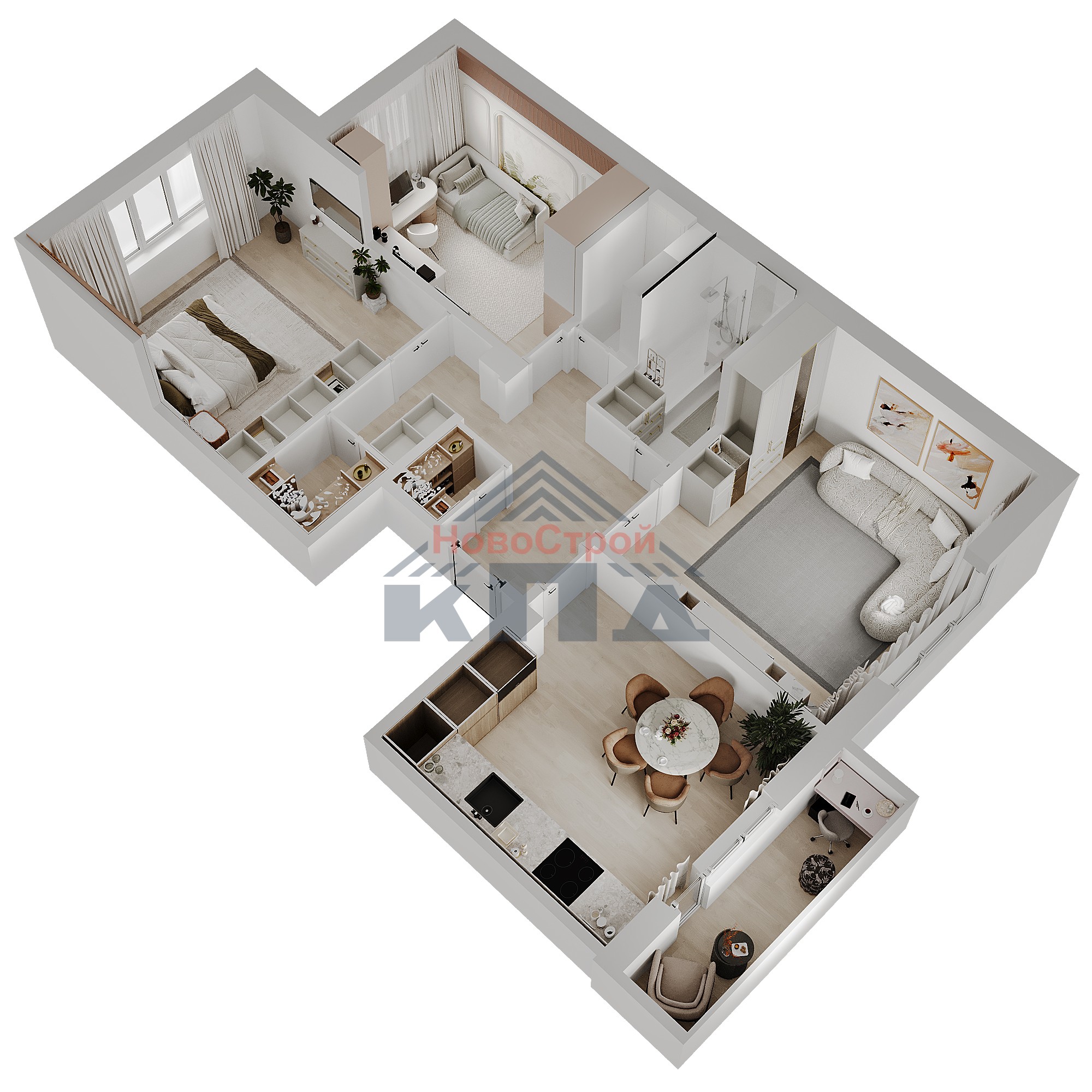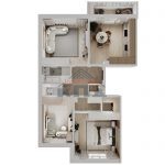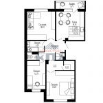 Две жилые комнаты примерно одинаковые по площади и обе квадратные в плане. В одной из них есть гардеробная. В каждой хватит для нескольких спальных мест, рабочей и игровой зоны. Третья комната чуть более 12 кв.м. может быть родительской спальней или комнатой для бабушки. В холле между комнатами расположен раздельный санузел, оснащенный всем необходимым сантехническим оборудованием. Увеличенная площадь ванной комнаты, более 4 кв. м. позволит установить там стиральную машину или организовать место для хранения хозинвентаря.