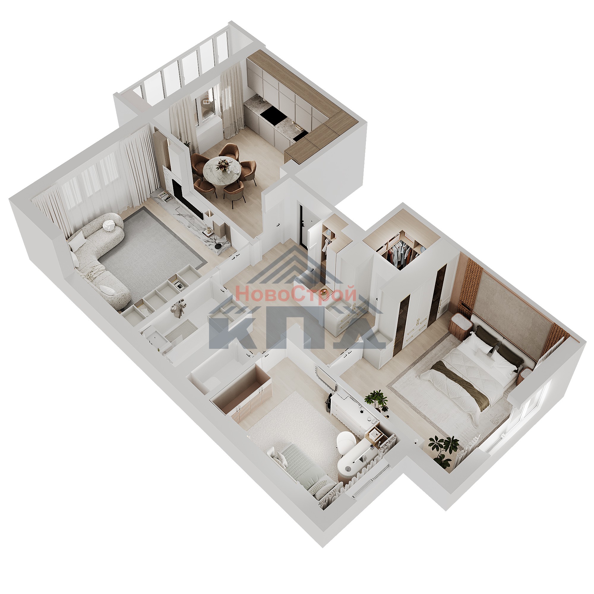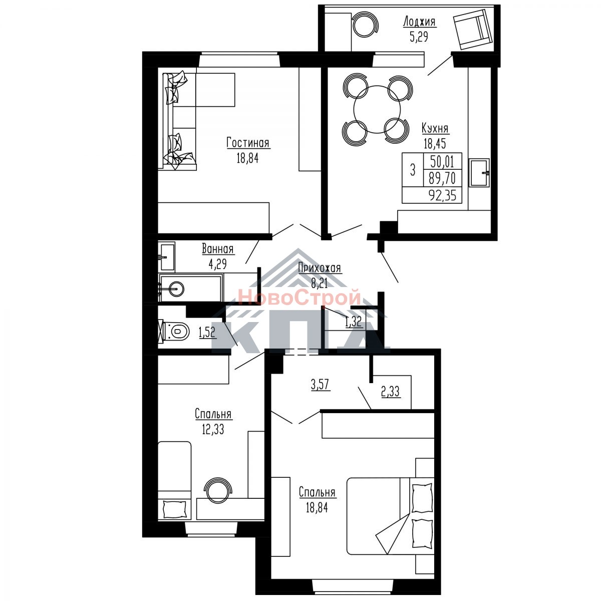 3-комнатная квартиры общей площадью 92,35 кв. м. вполне может считаться четырехкомнатной с тремя спальнями. Кухня-гостиная около 19 кв.м. может также быть общей комнатой для всей семьи, где за обеденным столом могут решаться проблемы или могут собираться для игры друзья, родные и близкие. Здесь возможно даже будет оставить ночевать на дополнительном спальном месте припозднившегося гостя. Кухня укомплектована электроплитой и раковиной, а также из кухни можно выйти на лоджию более 5 кв.м.   Такую возможность оценят, как хозяйки, так и другие члены семьи.