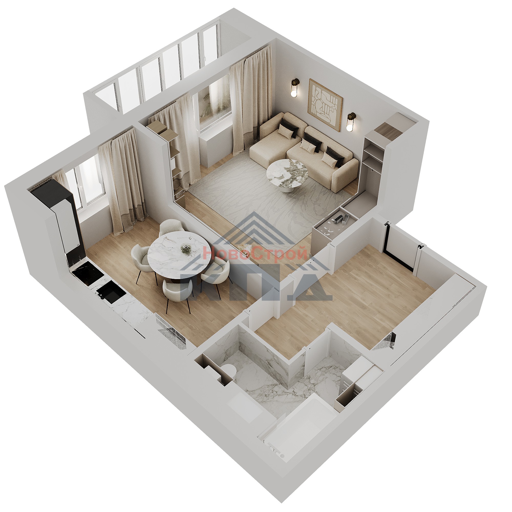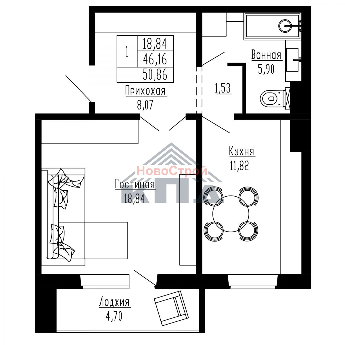 Просторная 1-комнатная квартира общей площадью 48,59 кв.м. может быть евродвушкой. У нее большая жилая комната с выходом на лоджию, которая прибавит еще почти 5 кв.м. Кухня-гостиная, площадь которой около 12 кв.м. будет местом, где за ужином могут разместиться все члены семьи и даже гости. Здесь же можно проводить совместно свободное время, играя в настольные игры или просматривая любимые киноленты. Совмещенный санузел увеличен до 6 кв.м., и хозяйка установит там не только стиральную машинку, но и пылесос, ведра и другой хоз. инвентарь. Но главной изюминкой в этой квартире будет огромная прихожая, ее площадь более 8 кв.м. На таком пространстве может разместиться не только вместительная гардеробная, но и библиотека или кладовая для заготовок на зиму. Окна квартиры выходят на восток.