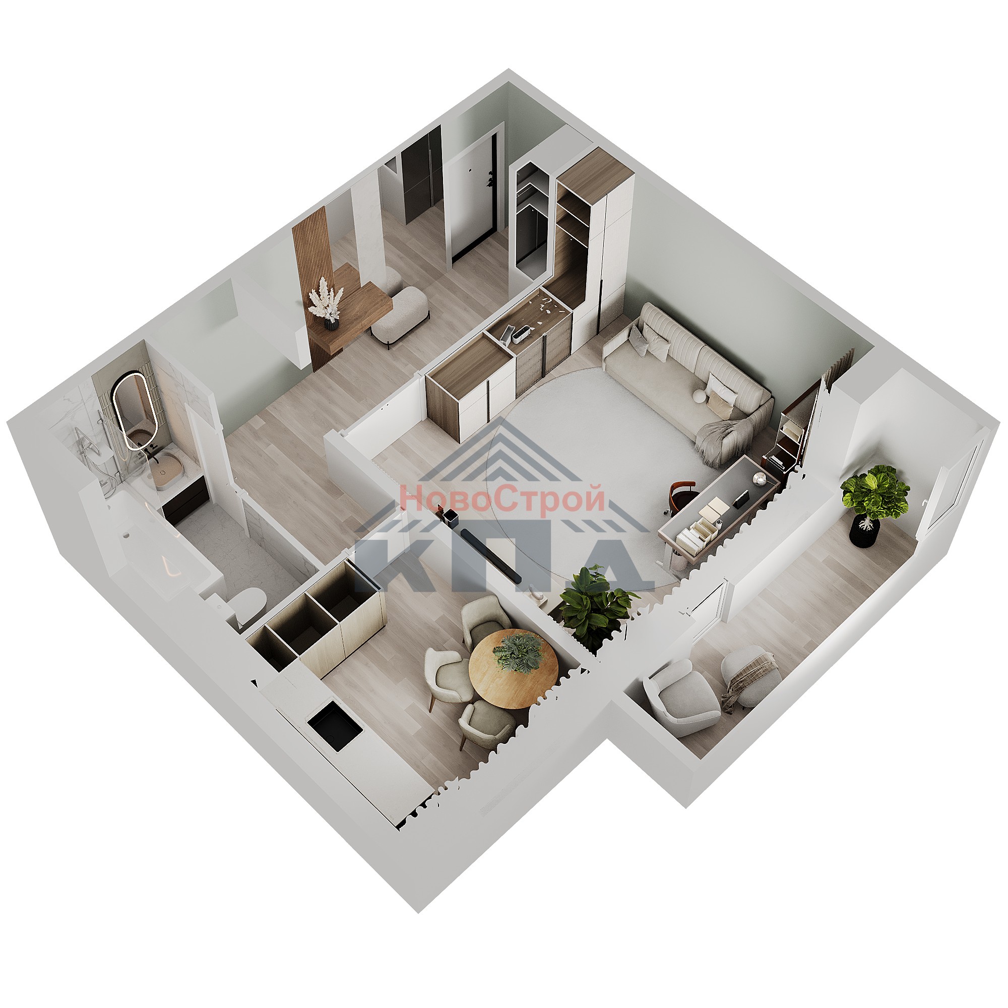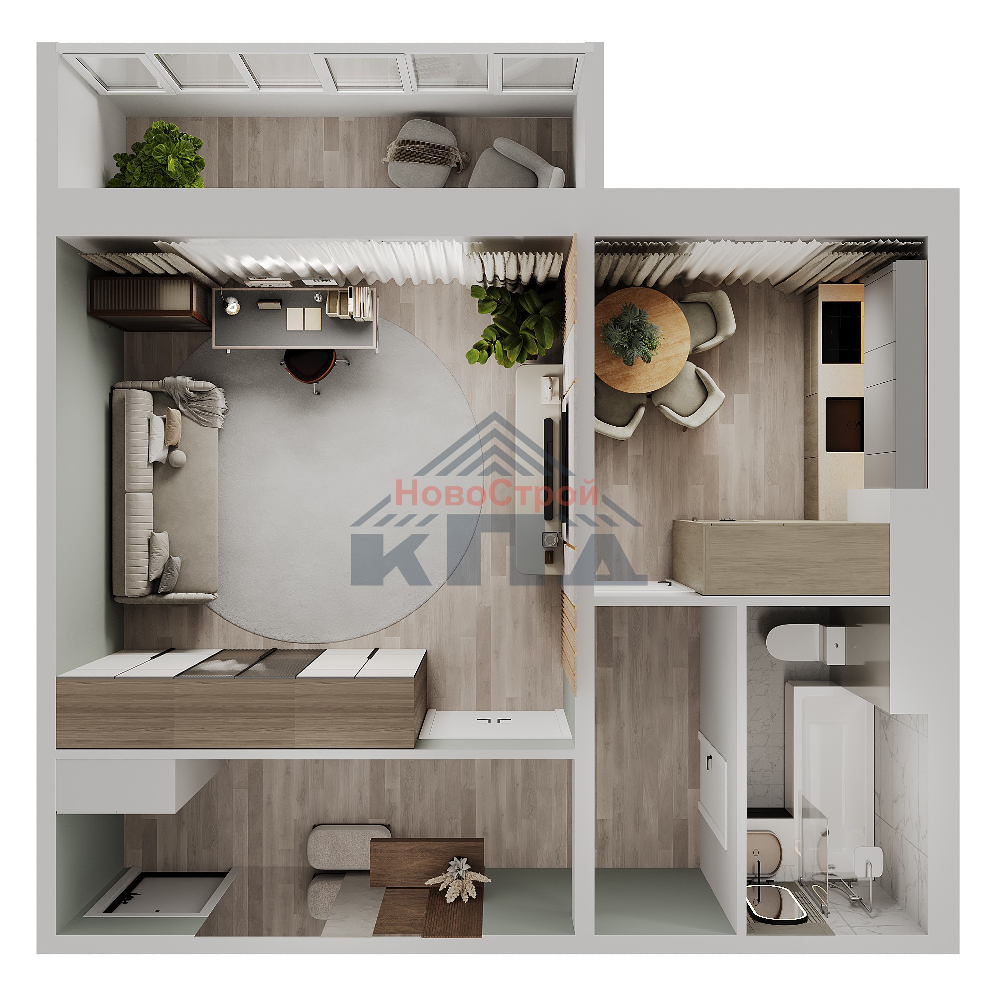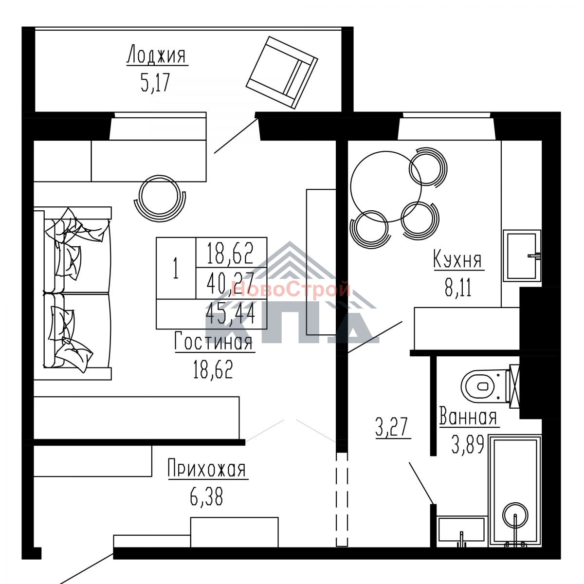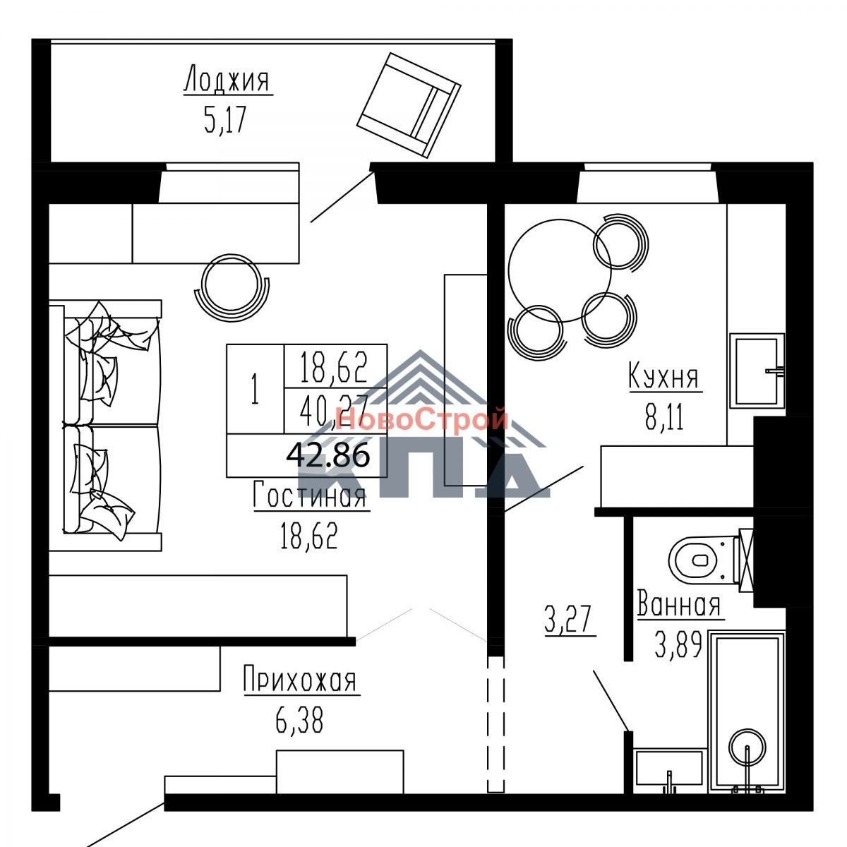 1-комнатная квартира 43,24 кв.м. с просторной кухней-гостиной более 12 кв.м. Увеличенное пространство на кухне позволит вам использовать жилую комнату, квадратную в плане, под спальню. Здесь же может расположиться кабинет. Лоджия более 5 кв.м. даст вам еще большие возможности для отдыха и хранения сезонных вещей. При входе в квартиру есть глубокая ниша, которую можно будет использовать, как гардеробную и кладовую для заготовок на зиму, т.к. она расположена рядом с кухней. Совмещенный санузел почти 4 кв.м. оснащен всей сантехникой. На кухне устанавливается электроплита. Окна квартиры выходят на восток.