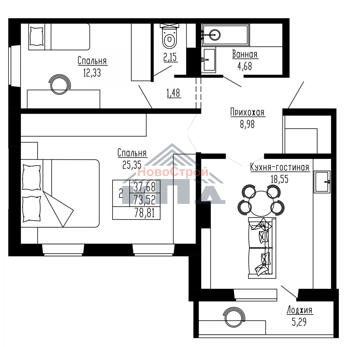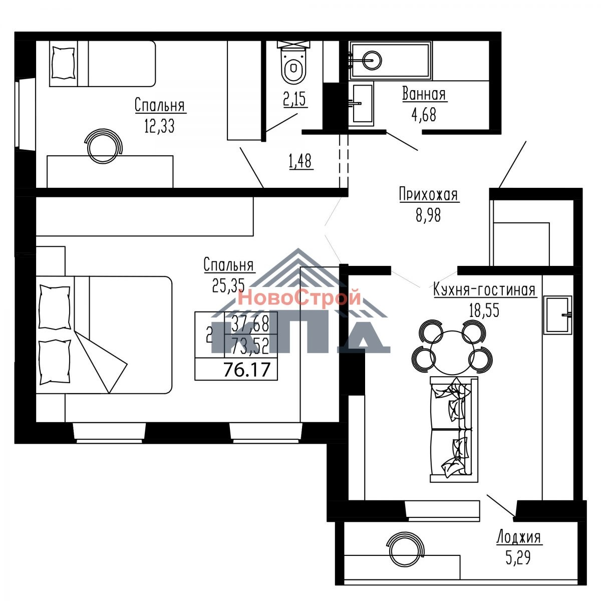 2-комнатная квартира площадью 76,17 кв.м. с просторными жилыми комнатами, одна из которых более 25 кв.м., другая – более 12 кв.м. В комнате большей площади два окна, это может вам дать возможность разместить детей разных полов или устроить для них спортивную зону. Рядом с комнатой меньшей площади расположен раздельный санузел, который укомплектован всей необходимой сантехникой. Площадь ванной комнаты увеличена и даст вам возможность установить стиральную машину и другой хоз. инвентарь. Кухня площадью почти 19 кв.м., квадратная в плане, может считаться кухней-гостиной. Такое пространство позволяет установить кухонный гарнитур любой формы и останется достаточно места для совместных ужинов, встреч с друзьями и близкими. Из кухни есть выход на большую лоджию, что очень нравится хозяйкам. Рядом с кухней, в прихожей есть удобное место для гардероба и кладовой. Окна кухни и большой жилой комнаты выходят на юго-запад, а комнаты поменьше – на северо-запад.