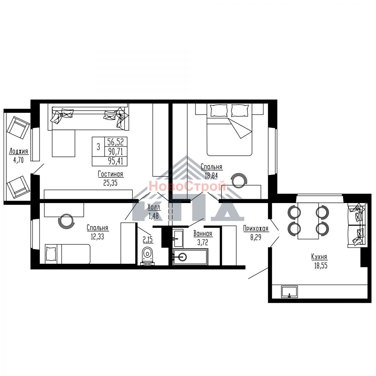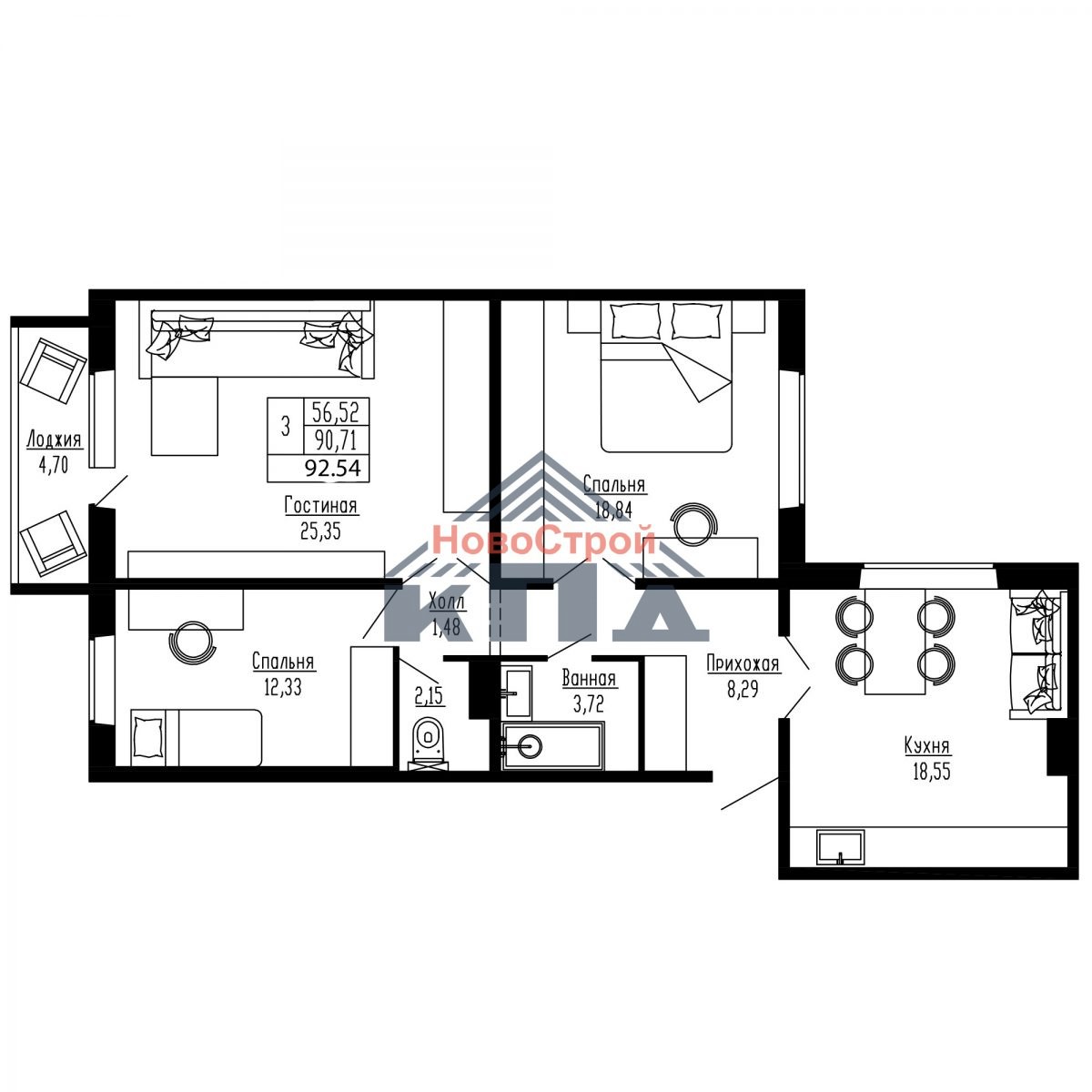 3-комнатная квартира площадью 93 кв.м. очень подойдет для большой дружной семьи. Три просторные комнаты, площадь которых 25, 19 и 12 кв.м., позволят разместить и 2-3 детей, и родителей, и даже бабушку и дедушку. Из самой большой комнаты можно выйти на просторную лоджию около 5 кв. м. Кухня удобная, квадратная в плане и площадью почти 19 кв.м. может выполнять функцию гостиной, где собираются все члены семьи за общим столом, где встречают родственников и друзей. Окна кухни и одной из жилых комнат выходят на юго-восток, во двор, окна двух других — выходят на северо-запад. В прихожей расположен раздельный санузел, в котором устанавливается все необходимое сантехническое оборудование.