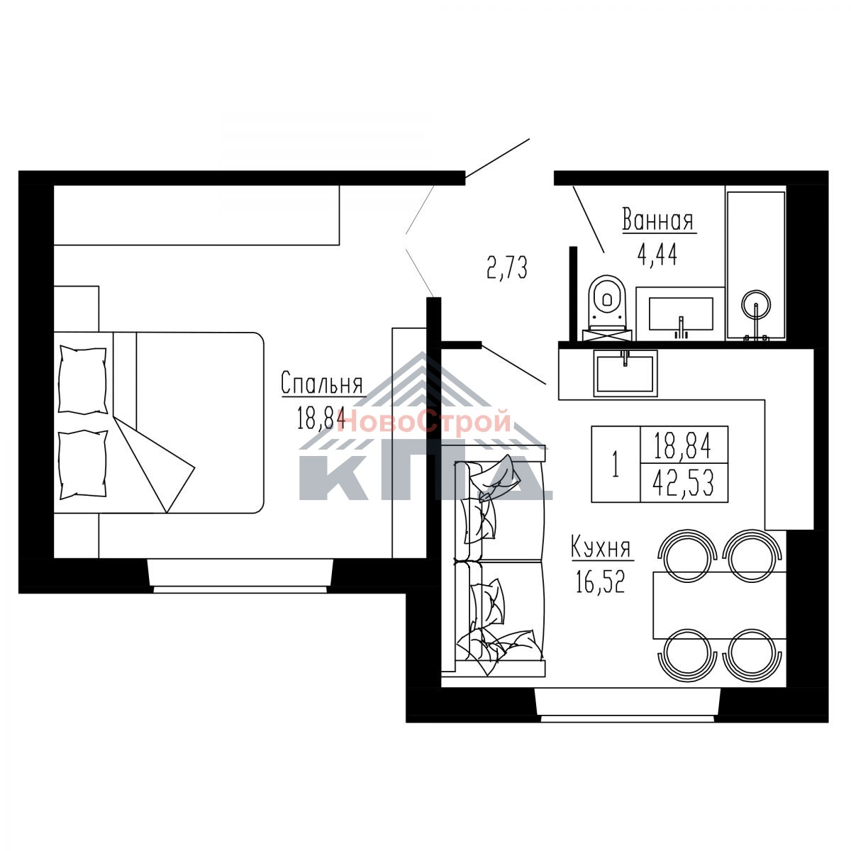 1-комнатная квартира общей площадью 42,53 кв. м. Просторная квадратная кухня около 17 кв. м. снабжена электроплитой и раковиной со смесителем. Такая кухня может вполне заменить гостиную, объединив всех членов семьи за чаепитием или любимым занятием. Жилая комната очень светлая уютная, также квадратная в плане. Удобное размещение розеток по всей комнате поможет вам организовать спальное и рабочее место или детскую зону. Окна в пол в квартирах со 2 по 14 этаж придадут вашей квартире интересный облик.