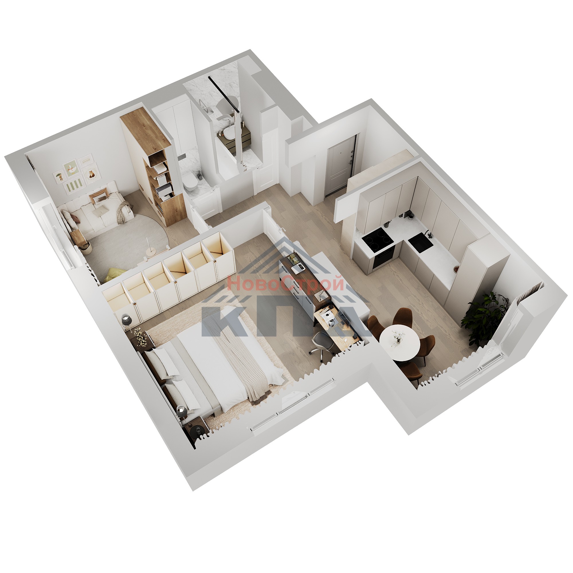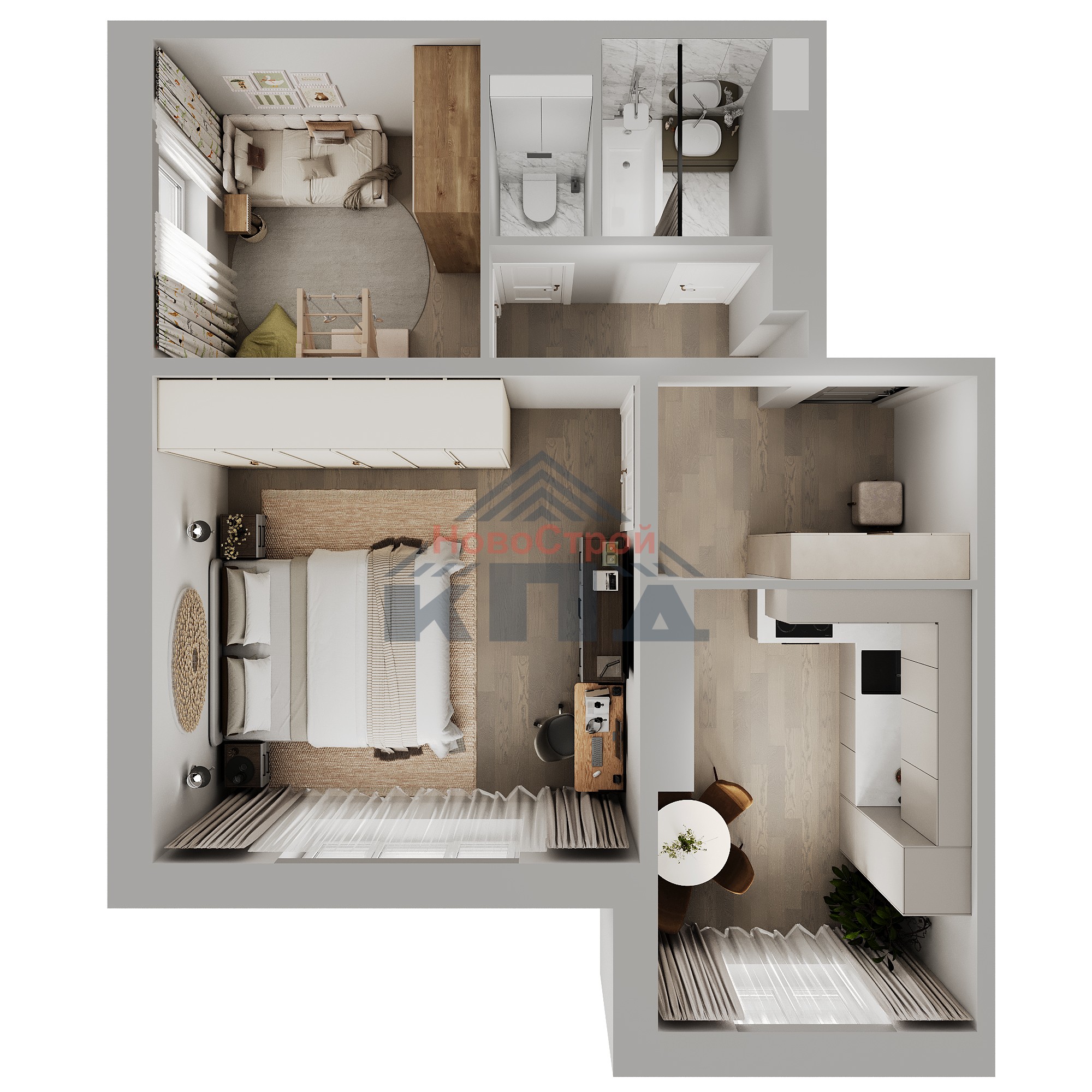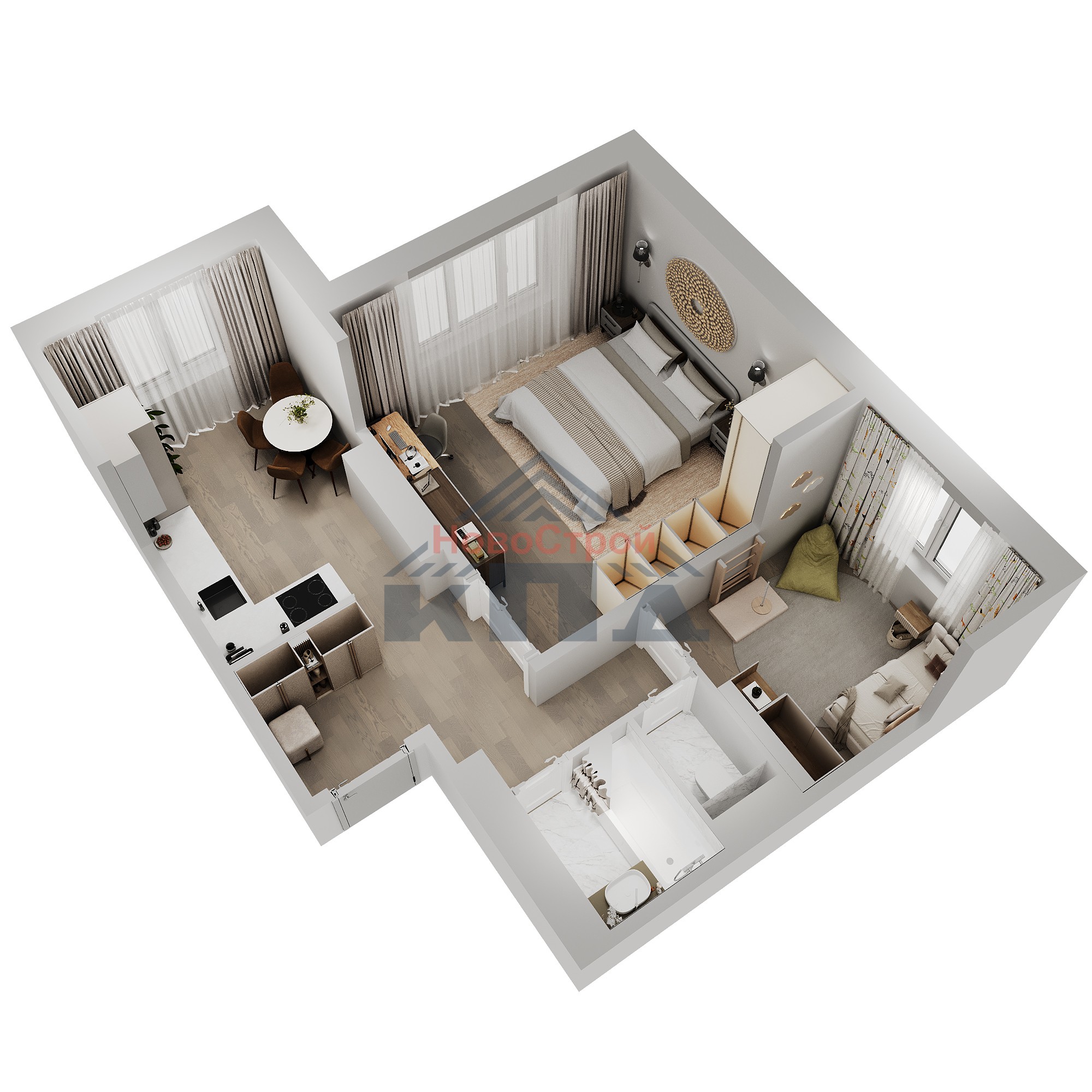 2-комнатная квартира приведенной площадью 49,79 кв. м. На кухне 11 кв. м. вы можете установить кухонный гарнитур с большой рабочей поверхностью и круглый обеденный стол для домочадцев и гостей. Со второго этажа в кухне устанавливается окно в пол. Просторная квадратная гостиная около 19 кв. м., здесь можно разместить и спальную зону, и рабочую, и зону отдыха. Рядом со спальней (или детской) более 8 кв. м. располагается раздельный санузел. В прихожей можно установить шкаф-купе. Вход в квартиру возможен через большой межквартирный холл (около 19 кв.м.) на три квартиры.