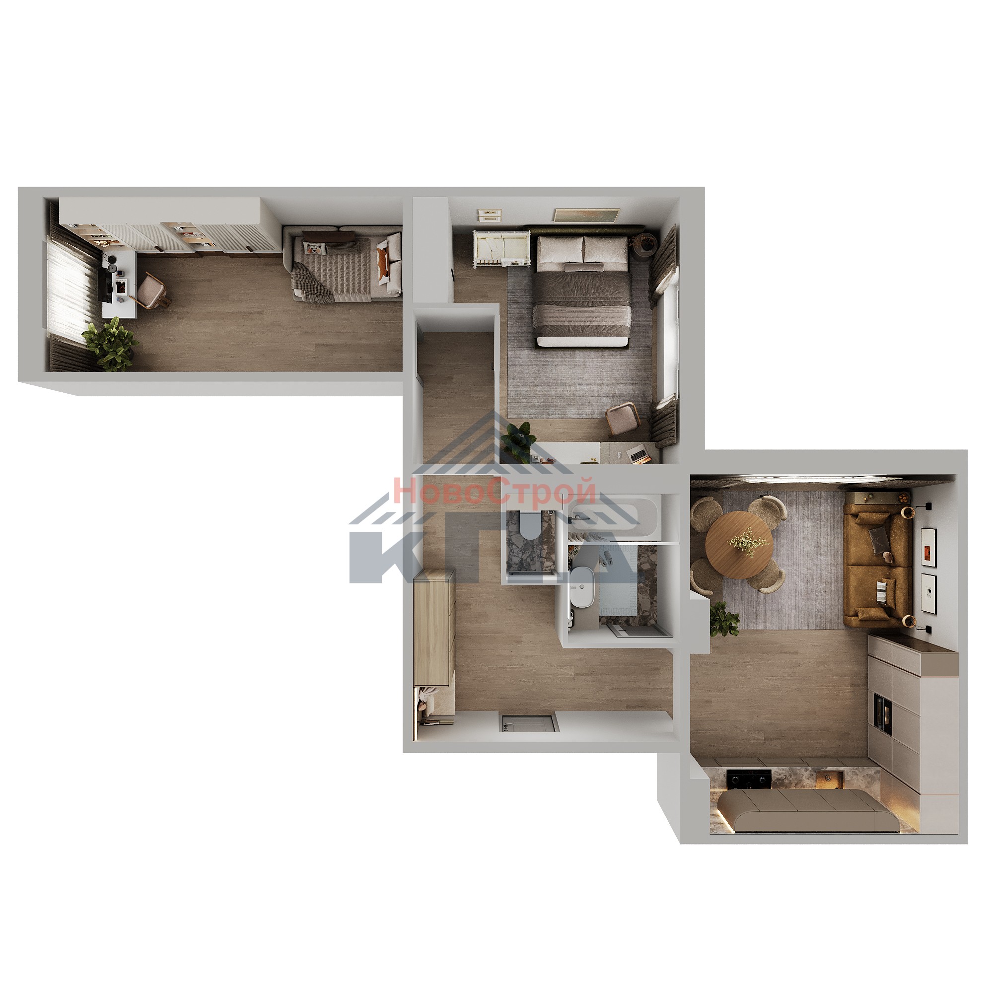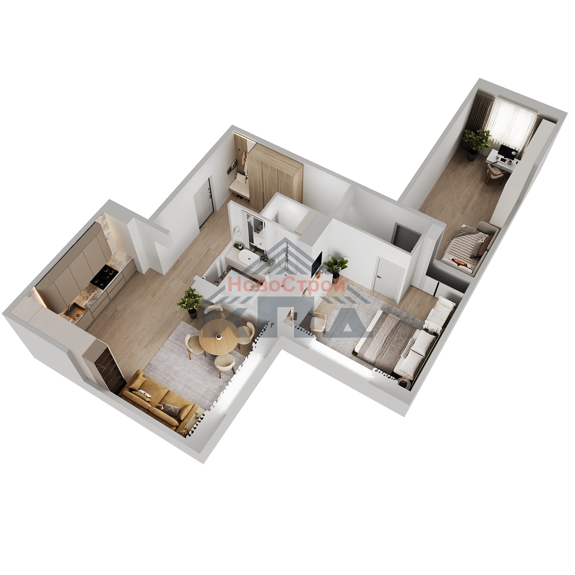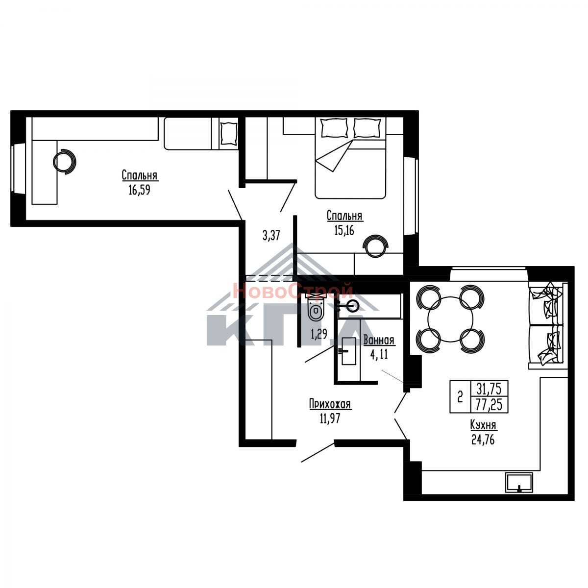 2-комнатная квартира площадью 77,25 кв.м. отличается от других квартир просторным холлом около 12 кв.м. На такой площади хватит места и для вместительной гардеробной, и для спортивного уголка. В кухне-гостиной почти 25 кв.м. устанавливается окно в пол, что добавит вам больше света и уюта. Такая кухня – гостиная будет любимым местом для семейных встреч за вкусным ужином. Одна из комнат почти 17 кв.м., другая – около 15 кв.м. с нишей под гардероб или рабочую зону. Увеличенная ванная комната будет пространством для отдыха, а также местом, где можно установить стиральную машинку и хранить хоз. инвентарь. Вход в квартиру через межквартирный холл на три квартиры.