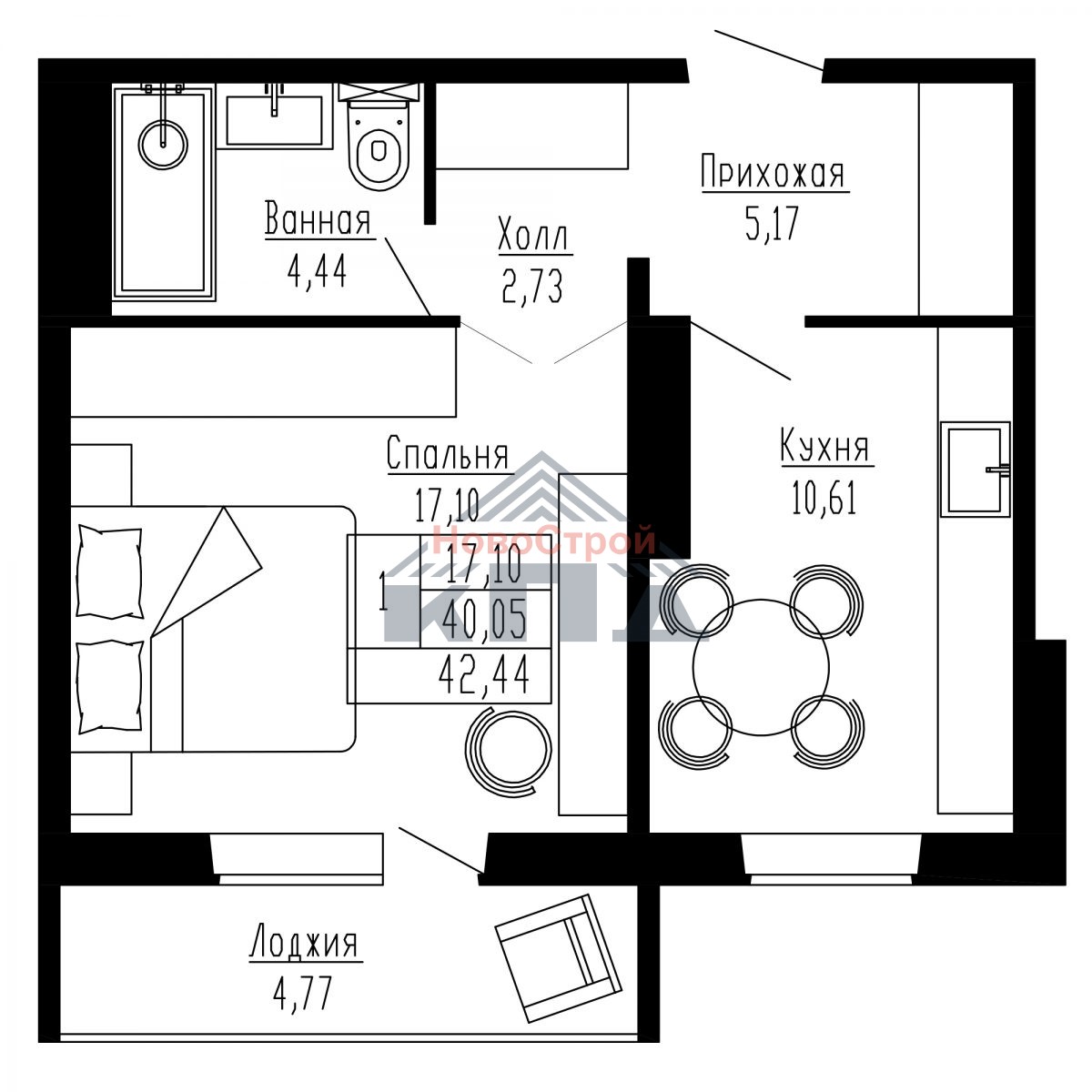 1-комнатная квартира 42,7 кв.м. (42,44 кв.м.) с просторной кухней-гостиной почти 11 кв.м.Увеличенное пространство на кухне, позволит вам использовать жилую комнату, квадратную в плане, под спальню. Здесь же может выделить место для детской кроватки или рабочую зону. Из комнаты можно выйти на лоджию с панорамным остеклением более 5 кв.м. с отличными видами на зеленый массив. Такая большая площадь позволит вам не только отдыхать, но и хранить сезонные вещи или велосипед. При входе в квартиру есть глубокая ниша, которую можно будет использовать, как гардеробную и кладовую для заготовок на зиму, т.к. она расположена рядом с кухней. Совмещенный санузел более 4 кв.м. оснащен всей необходимой сантехникой. На кухне устанавливается электроплита. Окна квартиры выходят на юг.