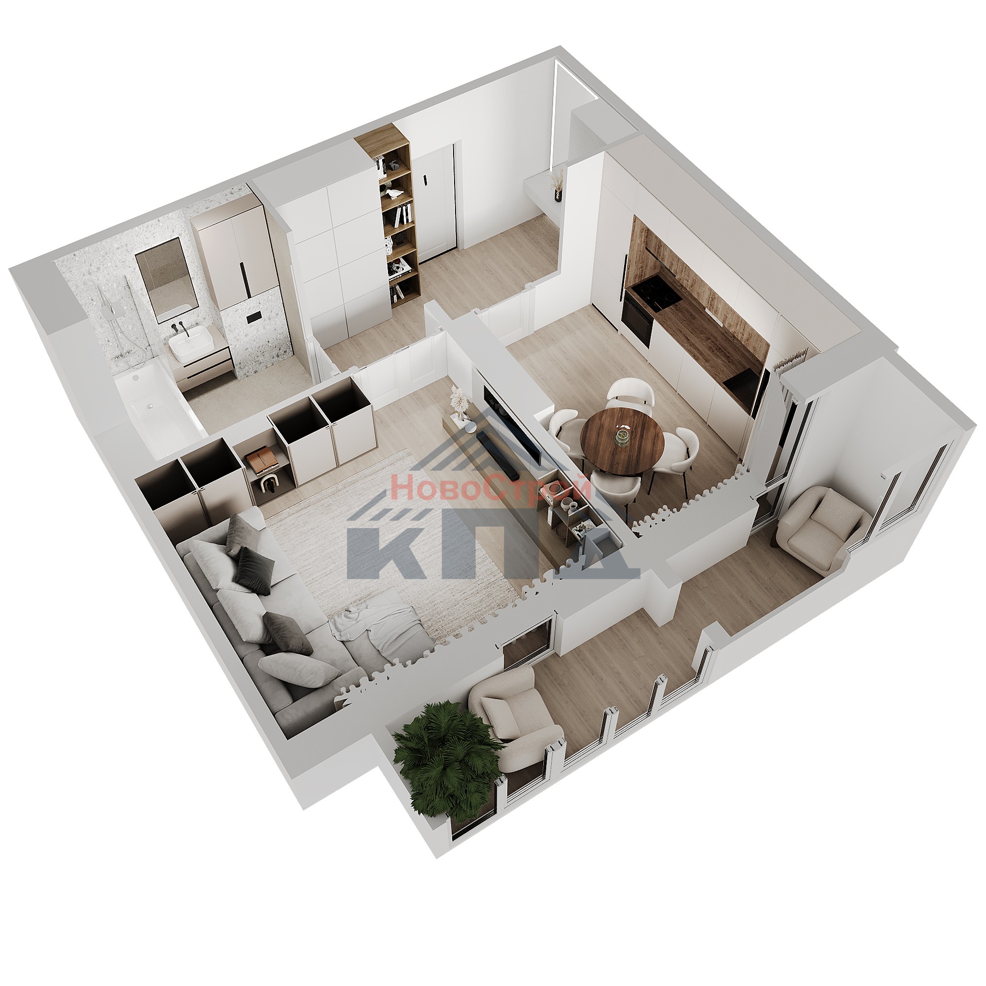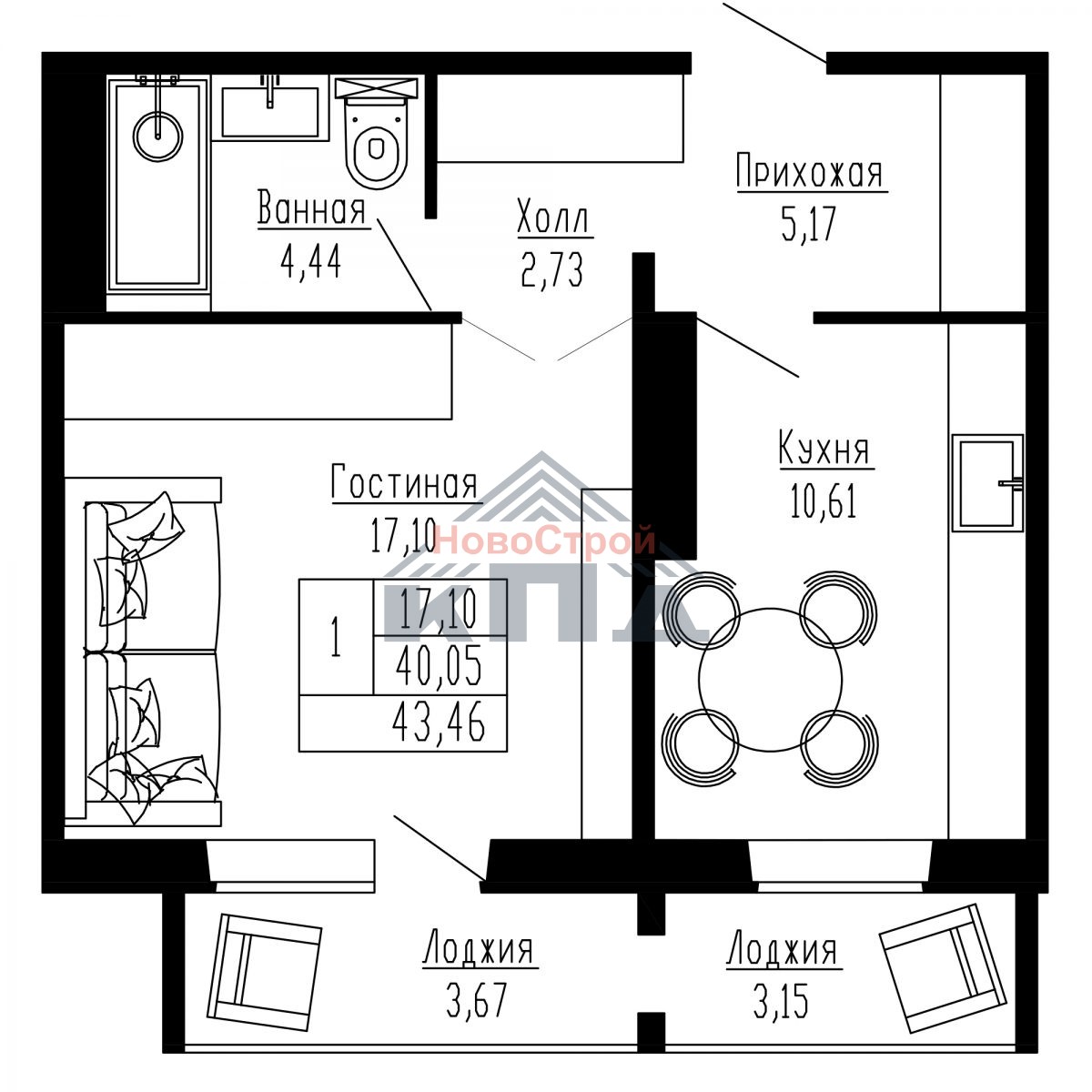1-комнатная квартира 43,66* кв.м. (43,46 кв.м.; 41.91 кв.м; 42,11 кв.м.; 43, 97 кв. м .; 43,33 кв.м.; 43,68 кв.м.) с просторной кухней-гостиной почти 11 кв.м. и двумя лоджиями. Выход на лоджию из кухни и из жилой комнаты. Панорамное остекление даст вам возможность отдохнуть, любуясь отличными видами на зеленый массив. Помимо возможности для отдыха и хранения сезонных вещей, хозяйки очень ценят, когда им удобно вывесить на лоджию белье или быстро заморозить пельмени.  Увеличенное пространство на кухне, позволит вам использовать жилую комнату, квадратную в плане, под спальню. Здесь же может расположиться кабинет или кроватка для самого маленького члена семьи. При входе в квартиру есть глубокая ниша, которую можно будет использовать, как гардеробную и кладовую для заготовок на зиму, т.к. она расположена рядом с кухней.  Совмещенный санузел более 4 кв.м. оснащен всей сантехникой. На кухне устанавливается электроплита. Окна квартиры выходят на юг.
