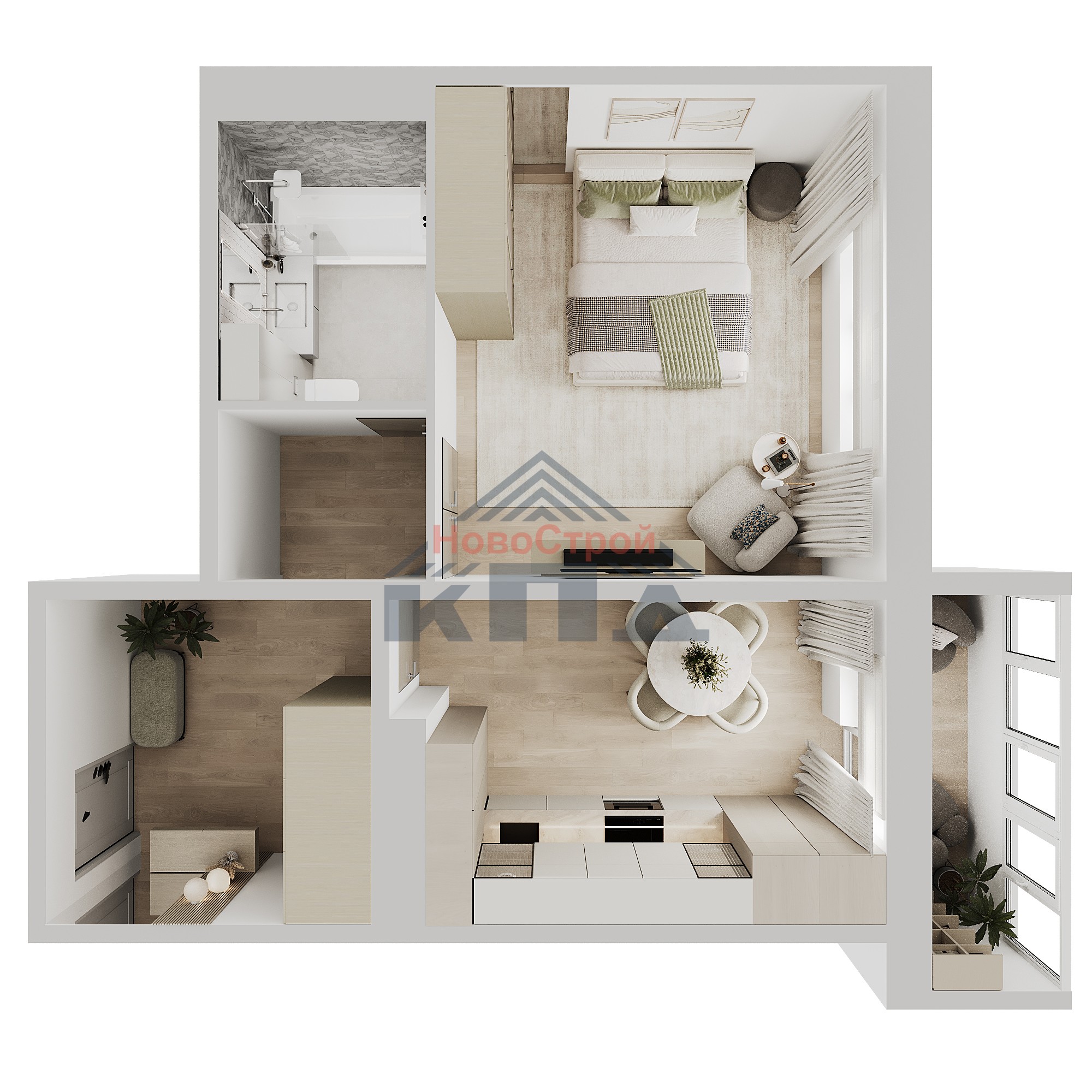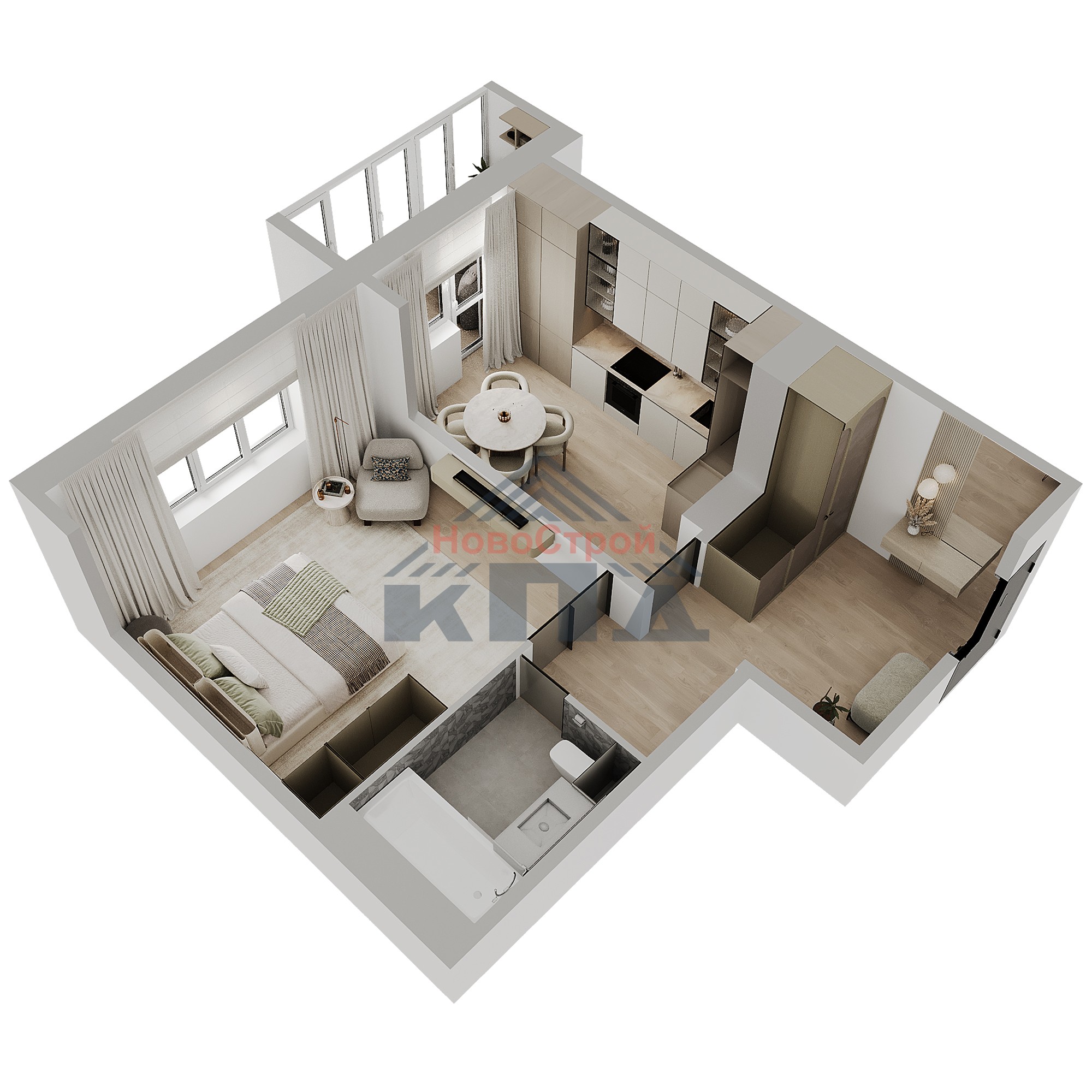 1-комнатная квартира 48,58* кв.м. (45,95 кв.м.; 46,15 кв.м; 48,27 кв.м.; 48,6 кв. м.) с увеличенной по площади кухней-гостиной почти 12 кв.м. и двумя лоджиями 4 и 5 кв.м. Выходы на лоджии из кухни и из жилой комнаты. Панорамное остекление даст вам возможность отдохнуть, любуясь отличными видами на зеленый массив. Помимо возможности для отдыха и хранения сезонных вещей, хозяйки очень ценят, когда им удобно вывесить на лоджию белье или быстро заморозить пельмени. Увеличенное пространство на кухне, позволит вам использовать жилую комнату, квадратную в плане, под спальню. Здесь же может расположиться кабинет или кроватка для самого маленького члена семьи. Рядом располагается совмещенный санузел почти 4,5 кв.м., оснащенный всей сантехникой. В большой прихожей, более 8 кв.м., есть возможность установить не только вместительный шкаф-купе, но и устроить зону релакса. На кухне устанавливается электроплита. Окна квартиры выходят на восток.