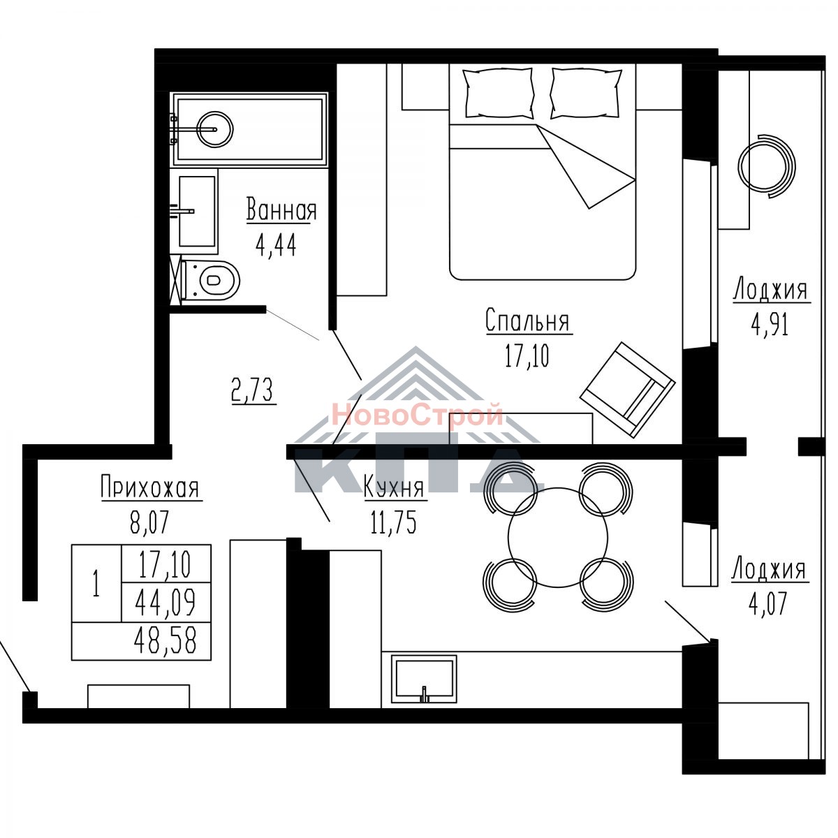 1-комнатная квартира 48,58* кв.м. (45,95 кв.м.; 46,15 кв.м; 48,27 кв.м.; 48,6 кв. м.) с увеличенной по площади кухней-гостиной почти 12 кв.м. и двумя лоджиями 4 и 5 кв.м. Выходы на лоджии из кухни и из жилой комнаты. Панорамное остекление даст вам возможность отдохнуть, любуясь отличными видами на зеленый массив. Помимо возможности для отдыха и хранения сезонных вещей, хозяйки очень ценят, когда им удобно вывесить на лоджию белье или быстро заморозить пельмени. Увеличенное пространство на кухне, позволит вам использовать жилую комнату, квадратную в плане, под спальню. Здесь же может расположиться кабинет или кроватка для самого маленького члена семьи. Рядом располагается совмещенный санузел почти 4,5 кв.м., оснащенный всей сантехникой. В большой прихожей, более 8 кв.м., есть возможность установить не только вместительный шкаф-купе, но и устроить зону релакса. На кухне устанавливается электроплита. Окна квартиры выходят на восток.