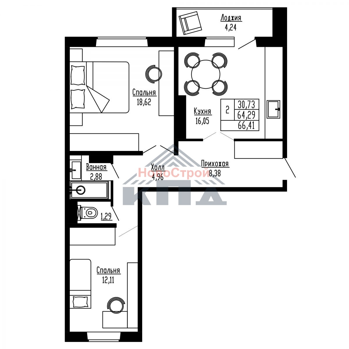2-комнатиная квартира 66,41* кв.м. с просторной кухней 16 кв. м..Из кухни можно выйти на лоджию с панорамным остеклением, которая более 5 кв.м. Об этом мечтают многие хозяйки. Так удобно морозить пельмени, сделанные всей семьей за круглым столом или повесить белье, не бегая через всю квартиру. Да и всем членам семьи будет очень приятно отдохнуть после дел праведных с чашкой чая, наслаждаясь красивым пейзажем. Такая площадь кухни позволит вам использовать ее как кухню-гостиную, а две комнаты: 18,62 и 12,11 кв. м. – использовать под спальню и детскую или под две спальни. В них прекрасно могут поместиться, помимо кроватей: шкафы, столы, тумбы и стеллажи. Из комнаты меньшей площадью есть выход на лоджию 3,14 кв.м. в квартирах 1 и 2 этажей. Между комнатами расположен раздельный санузел, где установлено все необходимое сантехническое оборудование. А в большом коридоре (более 8 кв. м.) можно установить вместительный шкафы-купе и спортивный уголок.