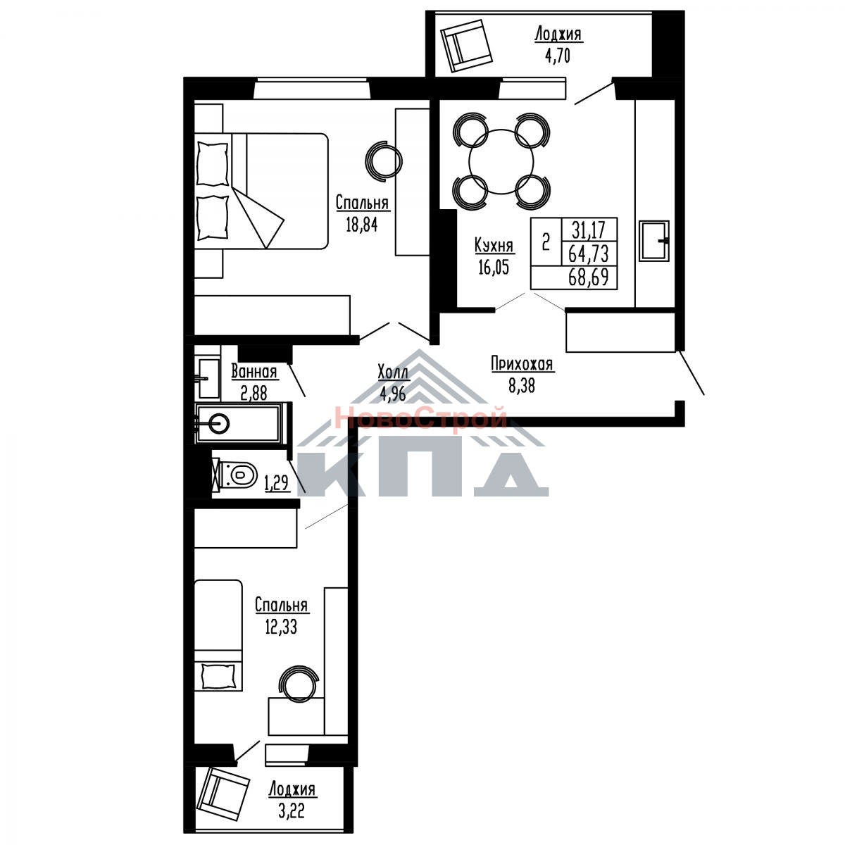 2-комнатиная квартира 68.69 кв.м. с просторной кухней 16 кв. м. Из кухни можно выйти на лоджию с панорамным остеклением, которая более 5 кв. м. Об этом мечтают многие хозяйки. Им удобно морозить пельмени, сделанные всей семьей за круглым столом или повесить белье, не бегая через всю квартиру. Да и всем членам семьи будет очень приятно отдохнуть после дел праведных с чашкой чая, наслаждаясь красивым пейзажем. Такая площадь кухни позволит вам использовать ее как кухню-гостиную, а две комнаты: 18,84 и 12,33 кв. м. – использовать под спальню и детскую или под две спальни. В них прекрасно могут поместиться, помимо кроватей: шкафы, столы, тумбы и стеллажи. Из комнаты меньшей площадью есть выход на лоджию 3,14 кв.м. в квартирах 1 и 2 этажей. Между комнатами расположен раздельный санузел, где установлено все необходимое сантехническое оборудование. А в большом коридоре (более 8 кв. м.) можно установить вместительный шкафы-купе и спортивный уголок.